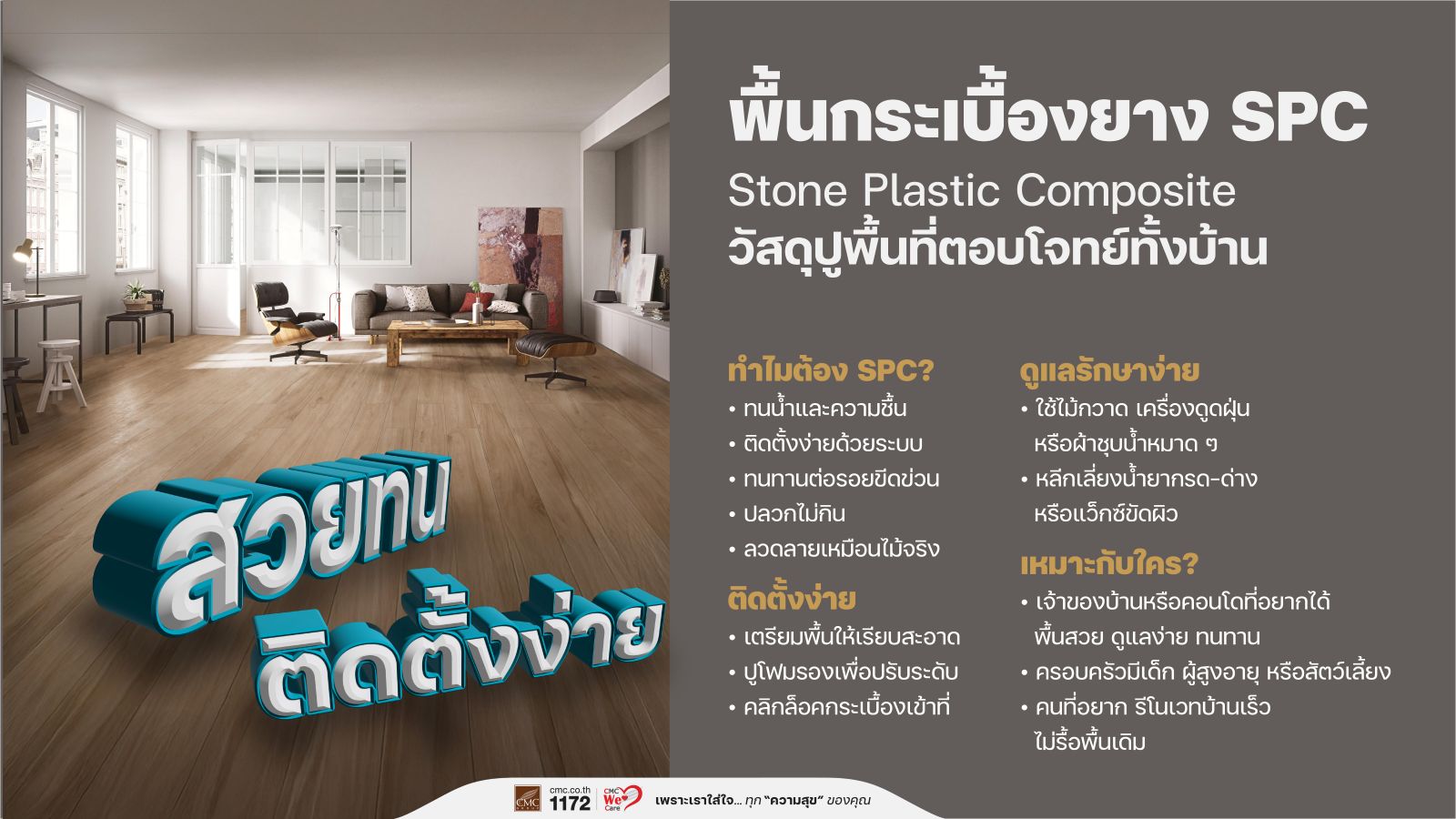 จุดเด่น ของ SPC คือสามารถติดตั้งแบบ Click Lock โดยไม่ต้องทากาว ทำให้ติดตั้งง่าย เป็นมิตรต่อสิ่งแวดล้อม และปลอดภัยต่อสัตว์เลี้ยง