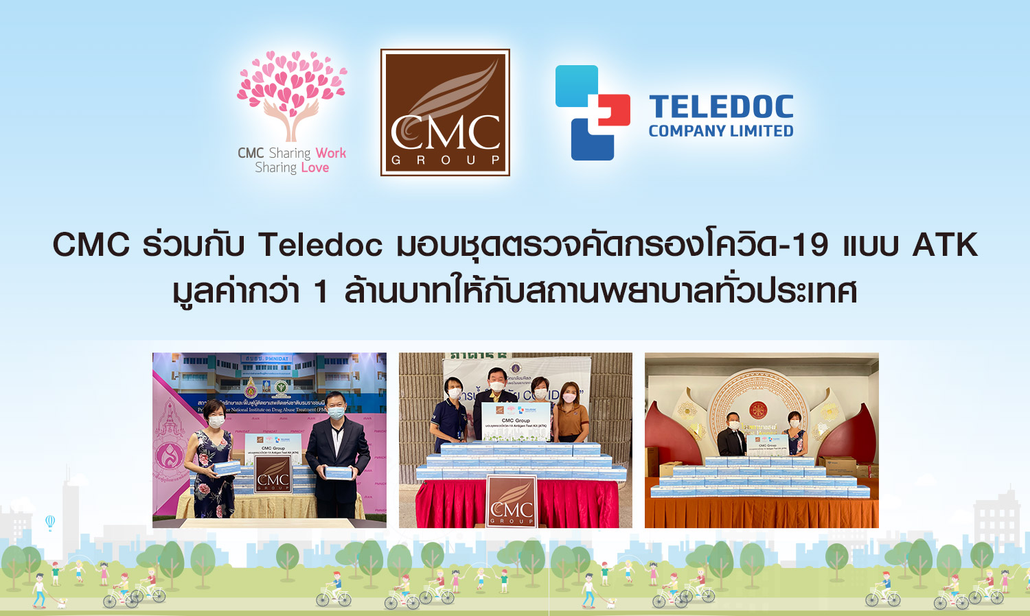 เมื่อเร็ว ๆ นี้ – บริษัท เจ้าพระยามหานคร จำกัด (มหาชน) (CMC) ร่วมกับบริษัท เทเลด็อค จำกัด (Teledoc) บริษัทในเครือ ภายใต้โครงการ CMC Sharing Work Sharing Love เดินหน้าช่วยเหลือมอบชุดตรวจคัดกรองโควิด-19 (COVID-19 Scan) แบบ ATK (Antigen Test Kit) ATK จำนวน 1 ล้านบาทให้กับสถานพยาบาลทั่วประเทศ ซึ่งครั้งนี้ บริษัทฯ ส่งความห่วงใยไปไกลถึงจังหวัดศรีสะเกษ โดยได้รับเกีรยติจากนายแพทย์ชลวิทย์ หลาวทอง ผู้อำนวยการ โรงพยาบาลศรีสะเกษ แพทย์หญิงสรัญญา ส่งคุณธรรม และทีมบุคลากรทางการแพทย์ รับมอบชุดตรวจคัดกรองโควิด-19 แบบ ATK สำหรับใช้โดยบุคลากรทางการแพทย์ (Professional Use) ซึ่งนำเข้าโดย Teledoc เพื่อแทนความห่วงใยต่อบุคลากรทางการแพทย์และร่วมสนับสนุนการปฏิบัติงานของบุคลากรทางการแพทย์ให้ปลอดภัยห่างไกลโควิด-19 ทั้งนี้ บริษัทฯ ยังคงตึงราคาช่วยคนไทยได้เข้าถึงชุดตรวจ ATK คุณภาพดีตามมาตรฐานในราคาย่อมเยาเพียง 45 บาท