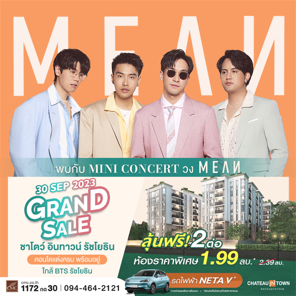 CMC ชวนคุณมาสนุกกับมินิคอนเสิร์ตวง MEAN ในงาน Grand Sale @ ชาโตว์ อินทาวน์ รัชโยธิน (Chateau In Town Ratchayothin) ลุ้นฟรี! 2 ต่อ! ต่อที่ 1 ลุ้นรับ! ห้องราคาพิเศษ 1.99 ลบ.* (จาก 2.39 ลบ.*) ต่อที่ 2 ลุ้นรับ! รถยนต์ไฟฟ้า NETA V* ภายในงานมีกิจกรรมหมุนวงล้อให้คุณได้รับของรางวัลพิเศษอีกมากมาย แล้วพบกัน 30 กันยายนนี้